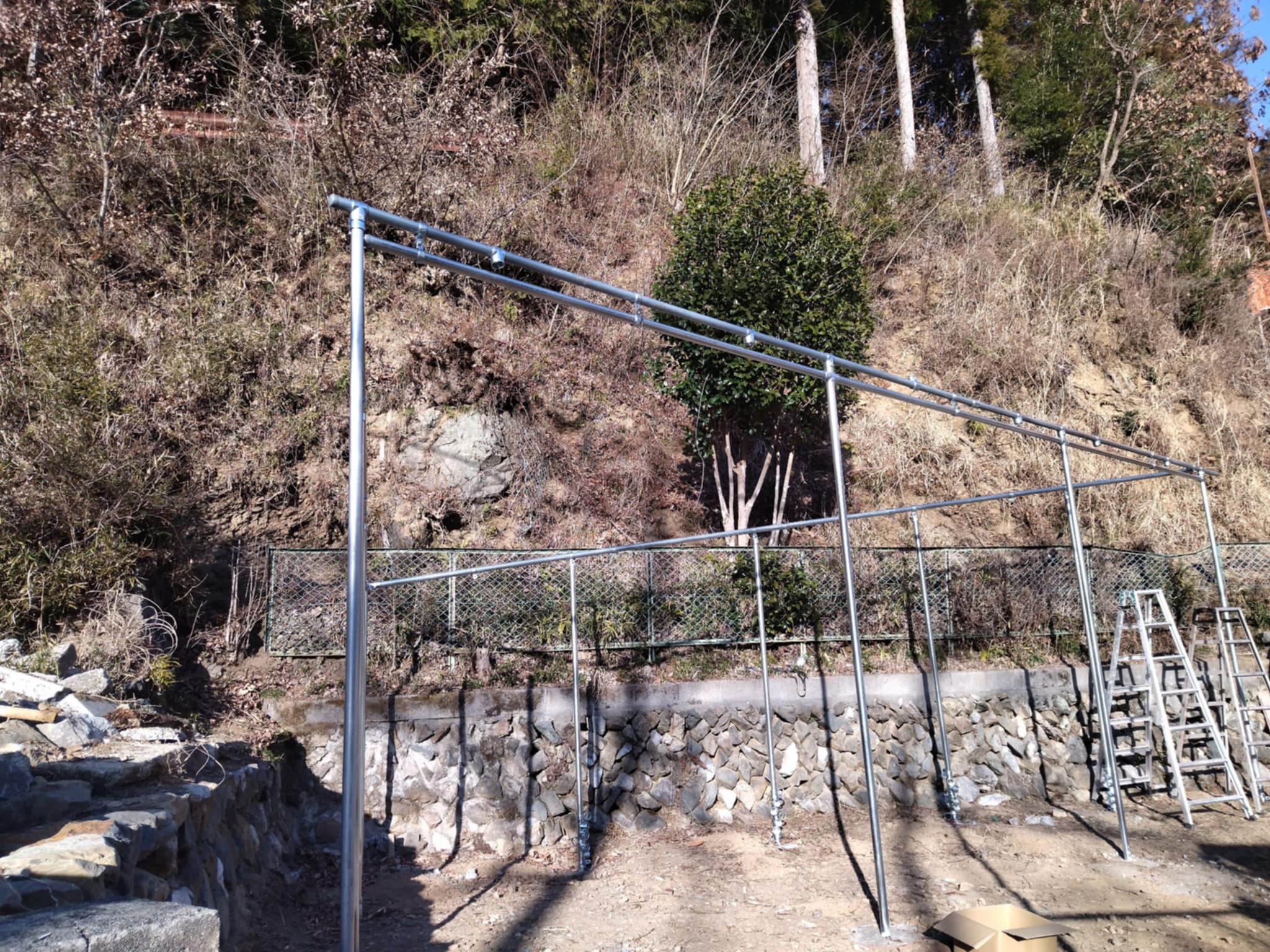 地面に穴をほって単管パイプの柱を埋め込みます。足元をコンクリートで固めます。